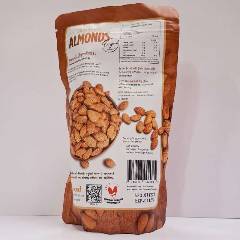 Roasted Almond / Kacang Almond Panggang ORIGINAL 150g adalah camilan sehat dan lezat yang terbuat dari kacang almond premium yang dipanggang hingga sempurna. Dengan rasa original yang alami, camilan ini kaya akan nutrisi seperti protein, serat, dan lemak sehat, menjadikannya pilihan yang ideal untuk gaya hidup aktif dan sehat. Dikemas dalam ukuran 150g yang praktis, Roasted Almond cocok dinikmati sebagai snack harian, tambahan untuk oatmeal, salad, atau baking. Nikmati manfaat kesehatan dan kelezatan kacang almond dalam setiap gigitan!